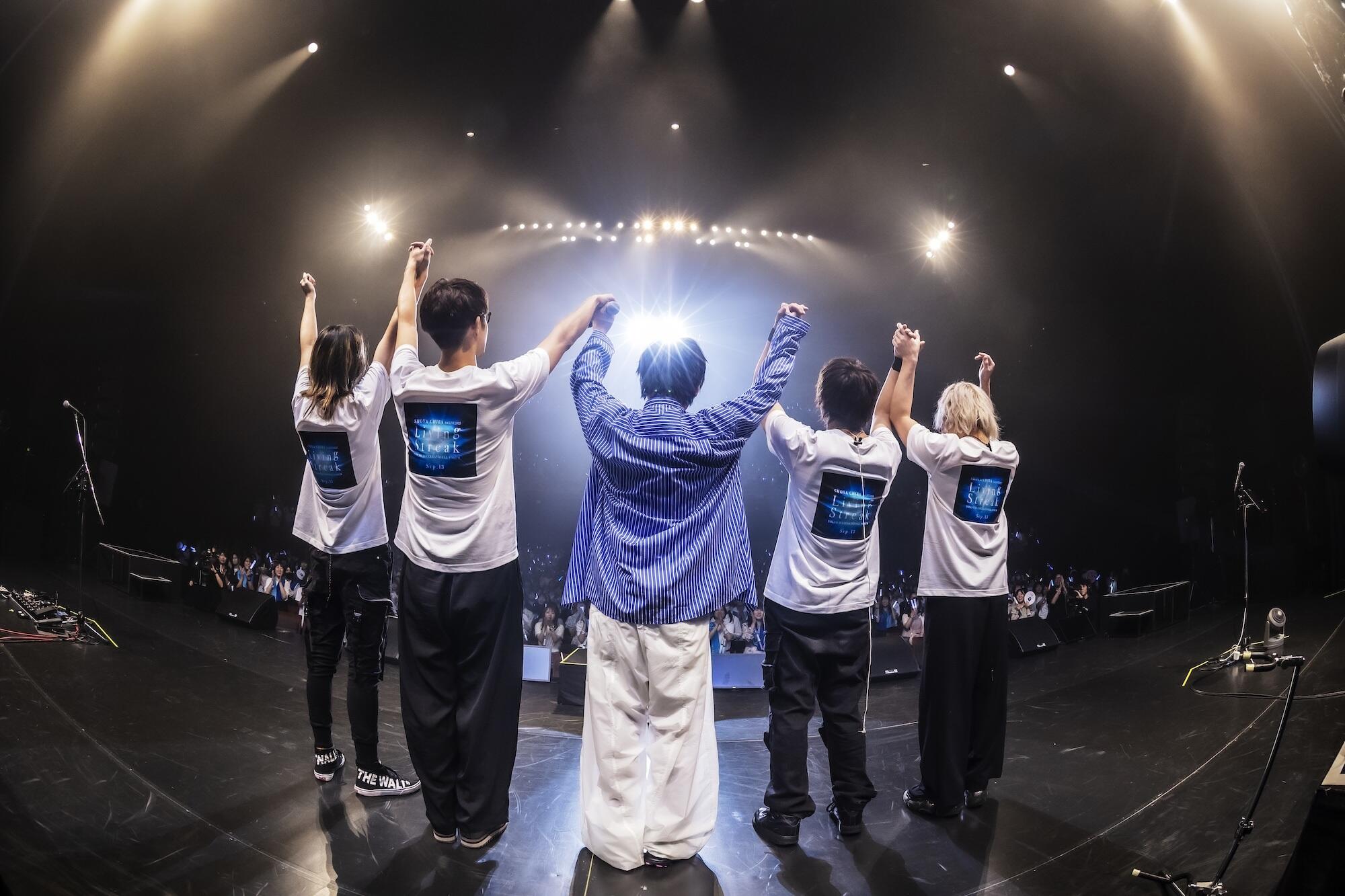 客席をバックにして笑顔で記念撮影、バンドメンバーとマイクオフで深々とお辞儀をした千葉翔也は