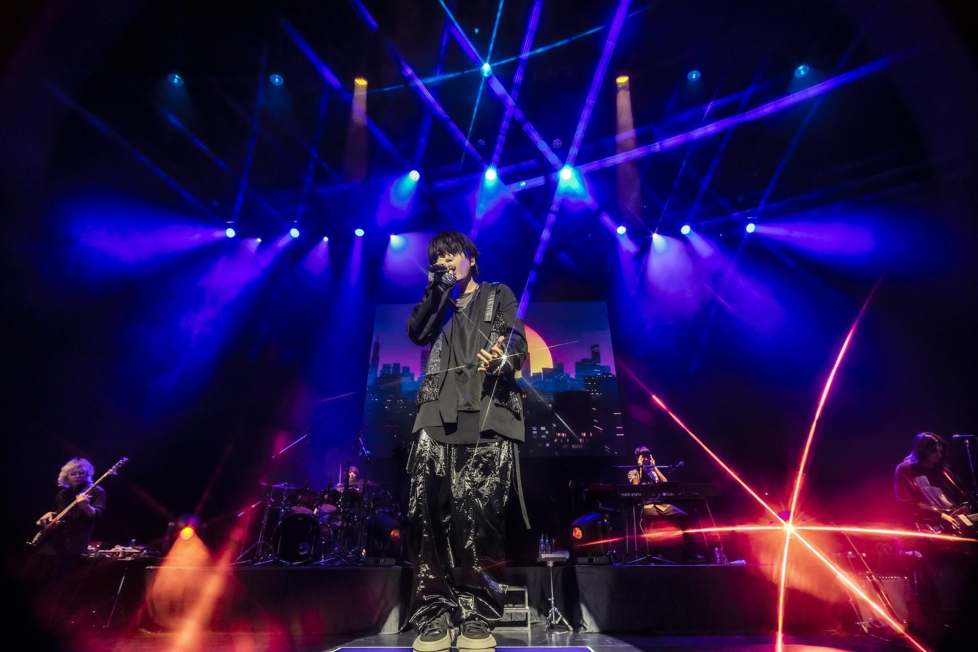 ソロアーティストデビューから1年半、待望の1stライブ当日は早くから、ライブTシャツやタオルなどをファッショナブルに着こなしたファンが多数集結。18時開演予定ということで千葉の大型フェスから駆け付けた猛者もいてホール周辺は大賑わい。関係各所とファンからのフラワースタンドが多数置かれたホール内は物販やフォトスポットに長蛇の列が形成され、グッズは完売が続出。入場すると、正面には大型スクリーンが下がり、二層式で構成されたステージ上段にはドラムセットとキーボードが置かれ、中央には階段が据えられている。