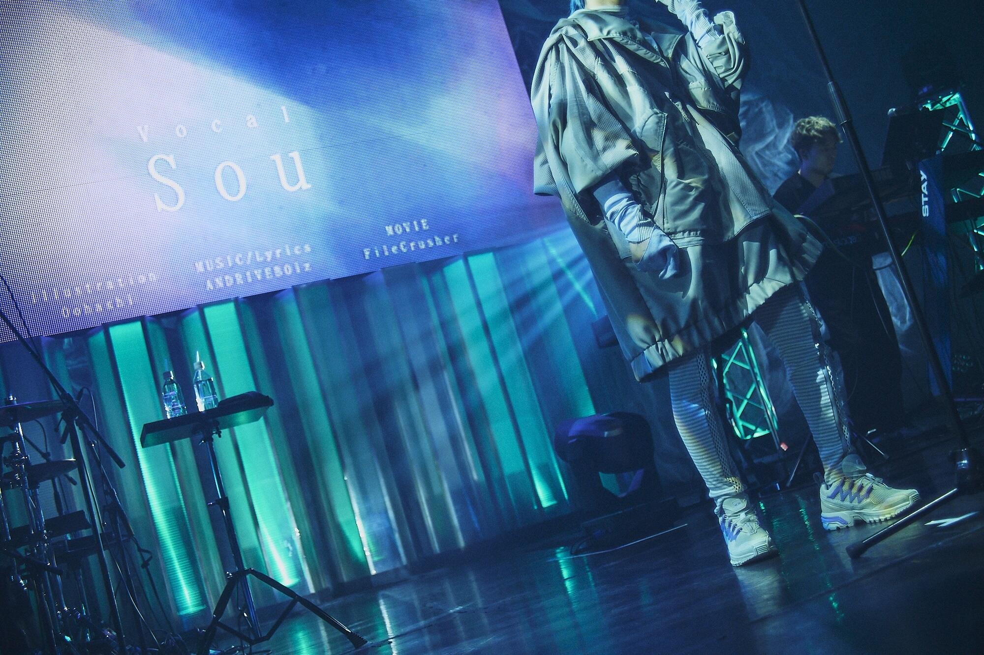 と告げたSouは拍手を受け、ヘッドフォンをして電車に乗った青年をモチーフにしたMVをバックに、『Terminal』へ。声に機械的なエフェクトを乗せてボーカロイドに寄せながら、「近くて遠い君と僕は 今すれ違う右左 みつけられないね」「いつまでも子供のままで 居たいんだ」「君に会いに行く」「僕らは出会う」と人間味溢れる想いを客席へ届ける。唄い終えたSouは