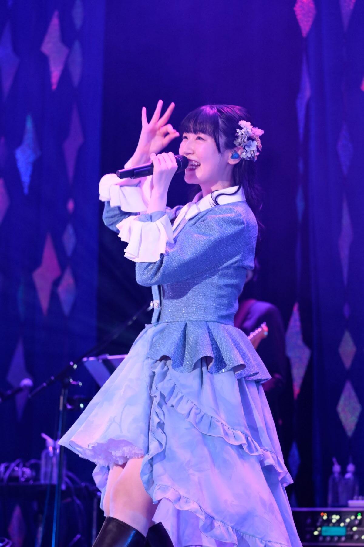 と伝え、『初雪とKiss』へ。ステージ上が青と白に彩られ、舞い落ちる雪を思わせるライティングと白一色のペンライトで冬景色に変わった場内へ、ゆったりしたメロディに乗せ「大事なことほど声にならなくて 大好きって君にまだ言えないまま」と澄んだ歌声を響かせる。印象的な「Kiss」のリフレインでコール&レスポンスで盛り上がると最後は口元に手を寄せて大歓声。自らが作詞を手がけた『アミュレット』では「またねすら 惜しい今も 言葉に託そう 今日をいつか忘れたって いつまでも思い出せる 言の葉のアミュレット」と笑顔に愁いを帯びた表情で想いを籠める。