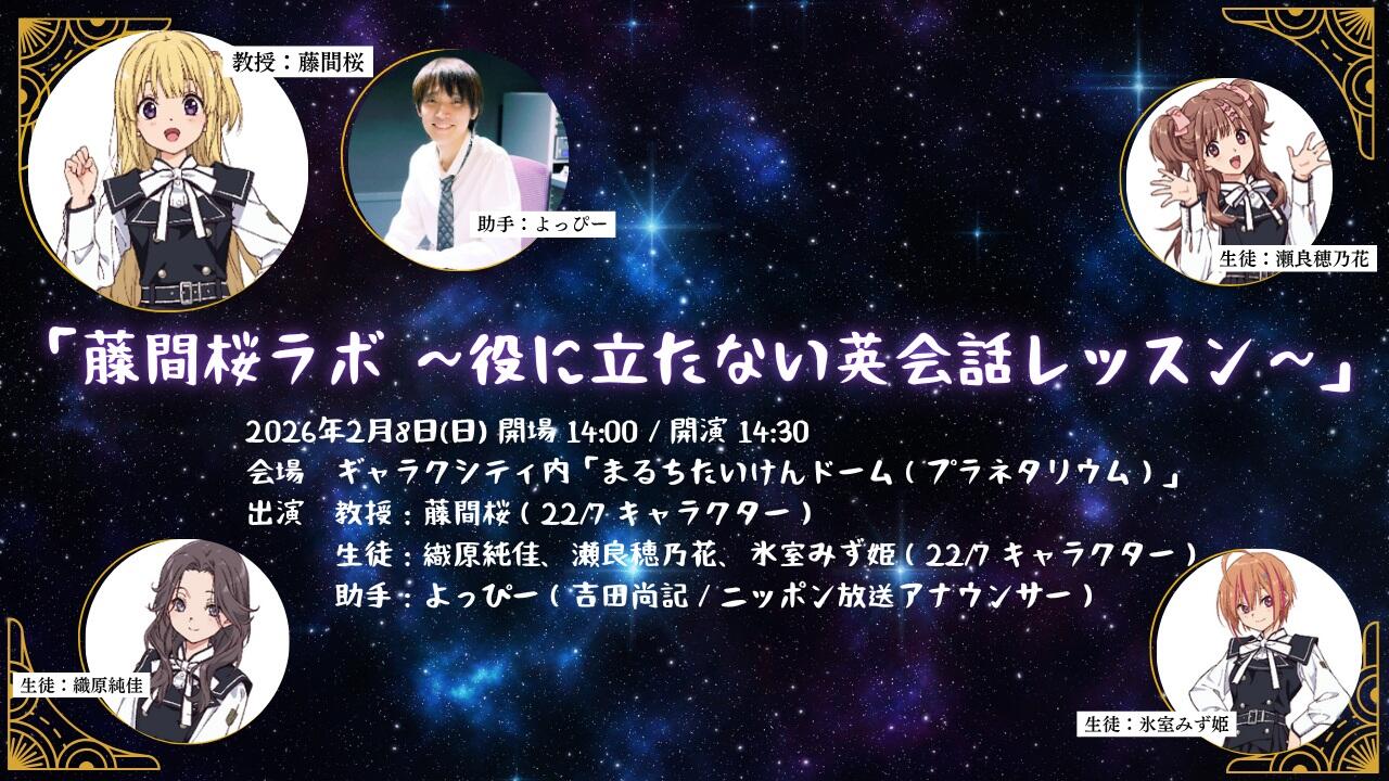 22/7のキャラクター・藤間桜が教授に扮し、「役に立たない英会話レッスン」など、ユニークな講義を展開。藤間桜のほか、織原純佳・氷室みず姫・瀬良穂乃花ら、22/7のキャラクターたちも次々と登場。こちらの講義では、よっぴーが助手(現地MC)としてサポートします。