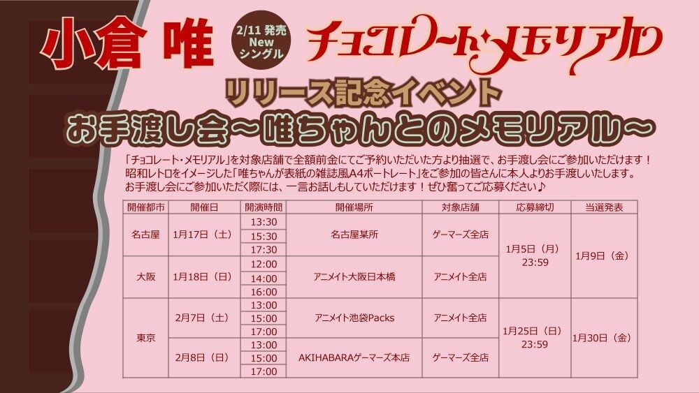 ◆リリース記念イベント情報小倉 唯 Newシングル「チョコレート・メモリアル」発売記念イベント