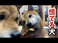 兄が食べる予定の芋をうっかり口にした柴犬がバレないように隠れる